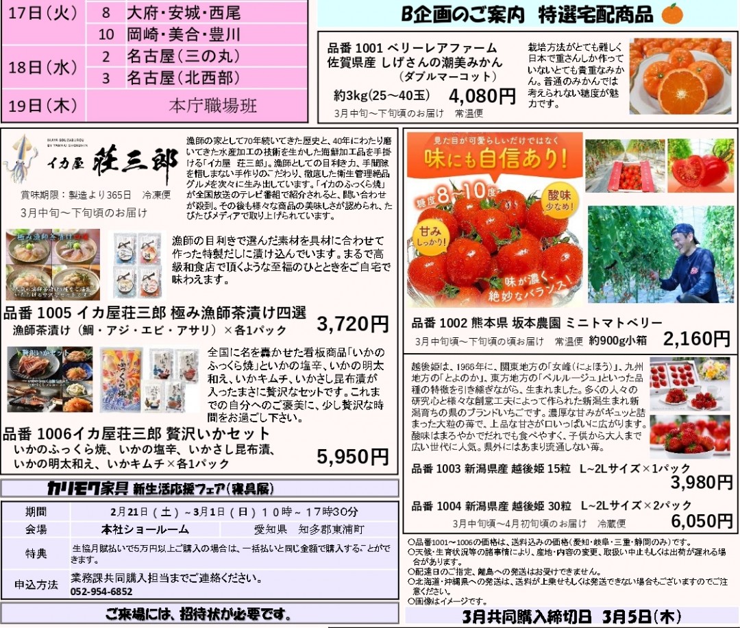 ※ 商品のお届け:原則として締切日以降に発送、月末までにお届けします。ご不明な点等がありましたら生協業務課業務担当までご連絡ください。